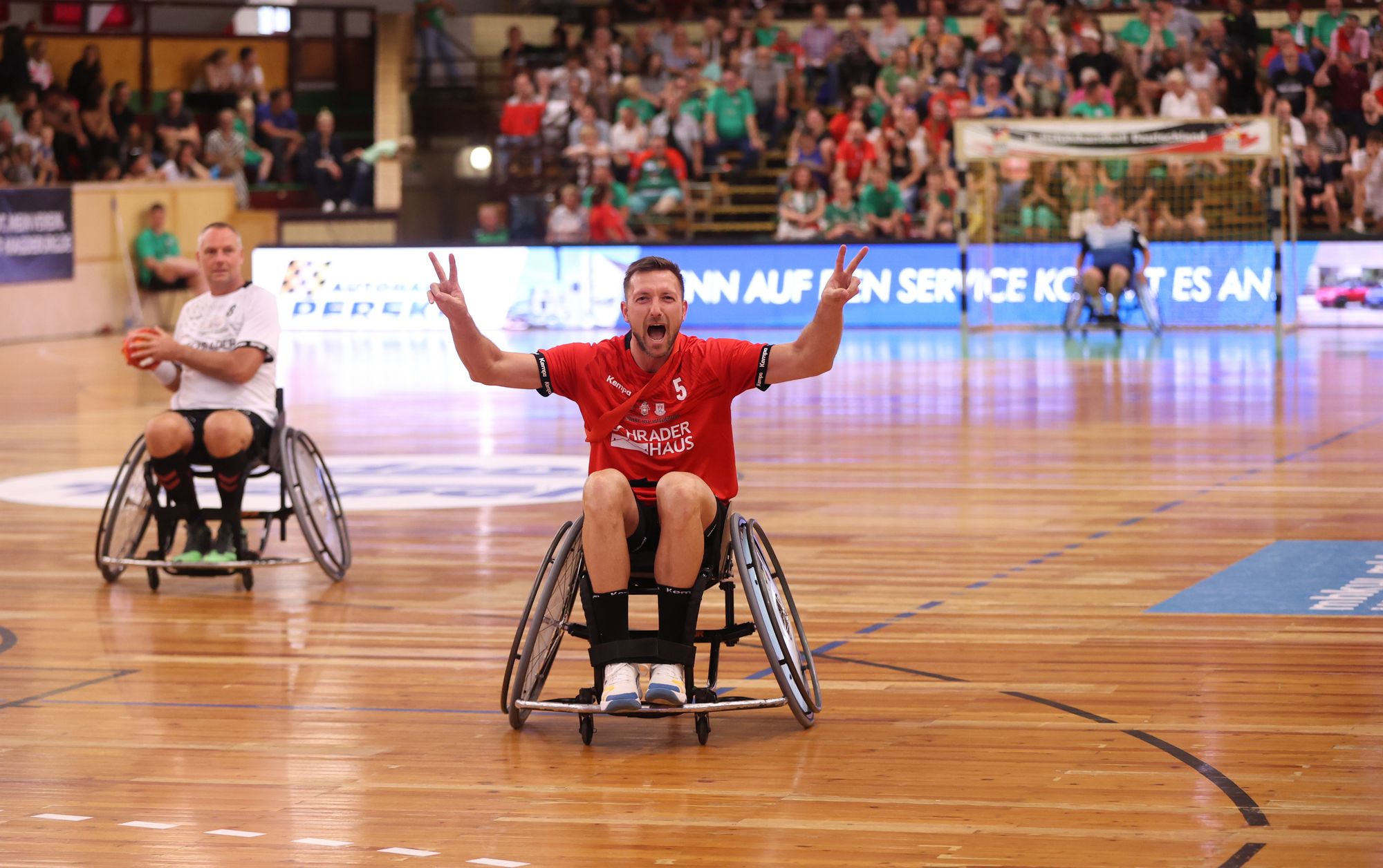 Vor über 2000 Zuschauern und einer großartigen Kulisse konnten die Rollstuhlhandballer mit ihrem Können auf ihre Sportart aufmerksam machen und die Zuschauer sichtbar begeistern. Bei dem Rollstuhlhandballspiel nahmen bekannte Persönlichkeiten wie Joél Abati, Christian Schwarzer und Steffen Weber in den Sportrollstühlen Platz. Abati, der bereits Erfahrungen mit dieser Sportart in Frankreich gesammelt hatte, berichtete von den Herausforderungen, die der Rollstuhlhandball mit sich bringt. "Es ist nicht leicht. Es braucht Kraft und Technik", so Abati. Das stellte auch Christian Schwarzer fest, der sich zwischenzeitlich an den Rollstuhl von Abati hängte, um nicht selbst den Sportrollstuhl anschieben zu müssen. Dies sorgte für viele Lacher auf der Tribüne. Obwohl der Großteil der All-Stars zum allerersten Mal in einem Sportrollstuhl platznahm, fanden die Spieler sich schnell gut zurecht und hatten viel Spaß am Rollstuhlhandball. Zwar stellte das Bewegen des Sportrollstuhls insbesondere beim Durchdringen der Abwehr eine Herausforderung dar, aber durch ihre Erfahrung und ihr hervorragende Handballverständnis gelang es ihnen dafür umso häufiger die erfahrenen Spielerinnen und Spieler des Demo-Teams von Rollstuhlhandball Deutschland mit großartigen Anspielen zu versorgen und so Torerfolge für ihr Team zu sichern. Mit einer besonderen Unterstützung auf dem Weg des strukturellen Aufbaus der Sportart in Deutschland überraschten die Veranstalter die Banditen am Ende der Partie. Der Fachbereichsleitung für Rollstuhlhandball vom Deutschen Rollstuhl Sportverband, Dr. Meike Lüder-Zinke, wurde ein Spendencheck über 500€ überreicht. Dr. Lüder-Zinke war völlig überwältigt. „Wir danken Ihnen sehr!