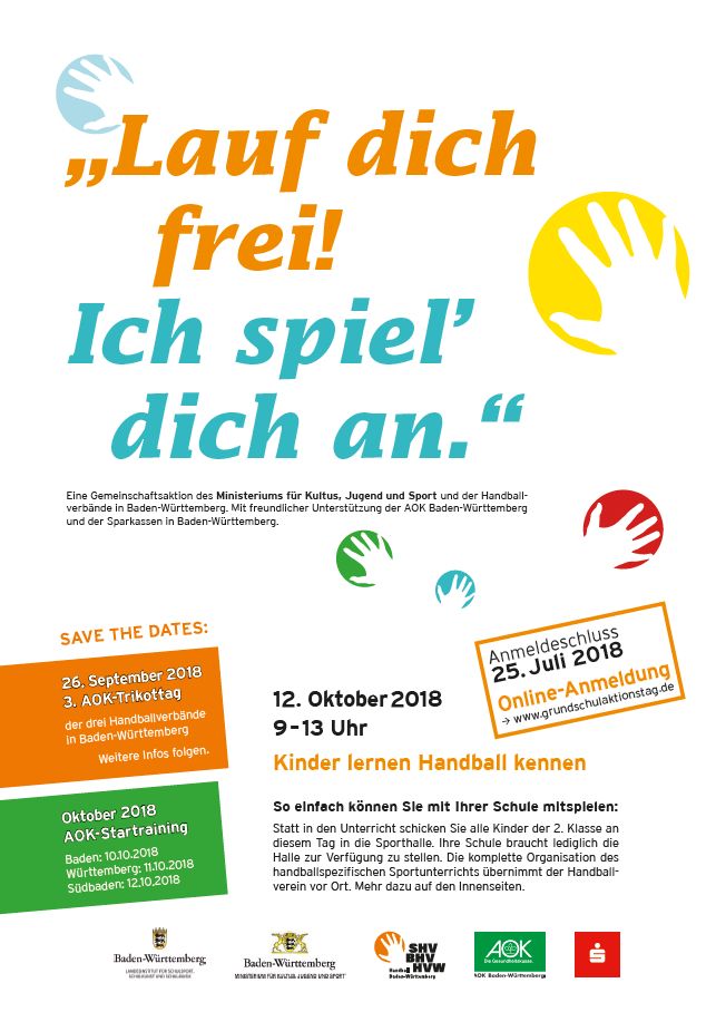 Der Grundschulaktionstag der drei Handballverbände in Baden-Württemberg findet in diesem Jahr am 12. Oktober statt. Die komplette Ausschreibung und alle Informationen zum Grundschulaktionstag sind unter <link http: www.grundschulaktionstag.de>www.grundschulaktionstag.de zu finden.